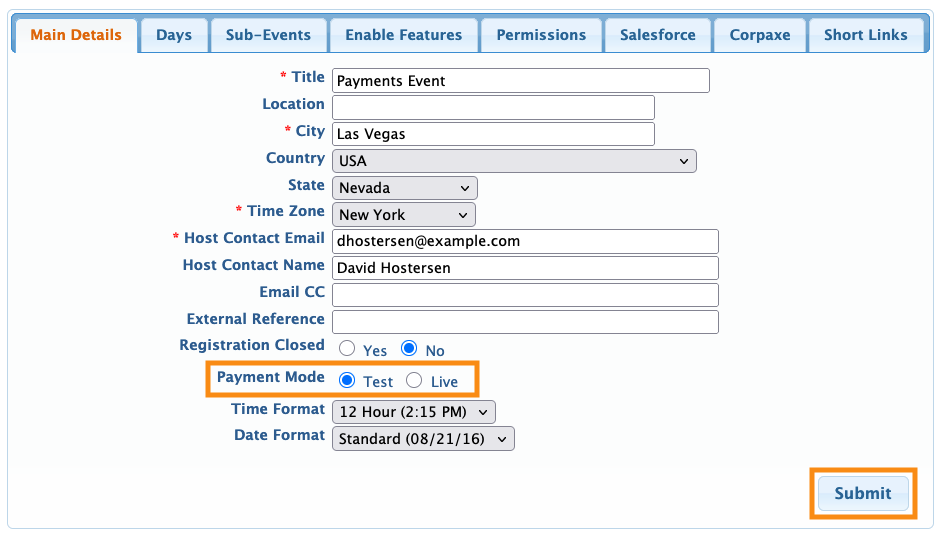 On the Main Details page, set the Payment Mode to Test. Then click Submit: