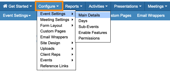To access the Test mode, head to the Configure tab. Choose Event Settings, then Main Details: