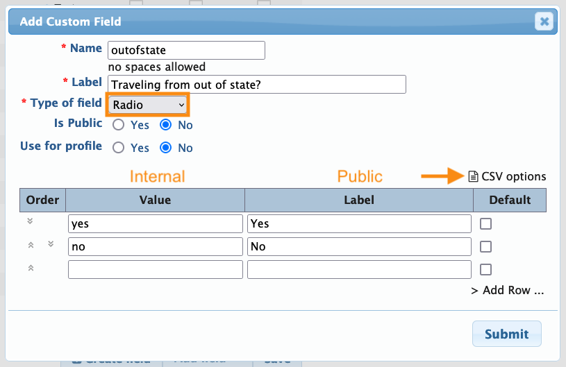 - Step 4. If you chose a field type that needs to have options attached, you’ll be prompted to add those next. In this example, we chose a Radio button that needs to offer the options of Yes and No.