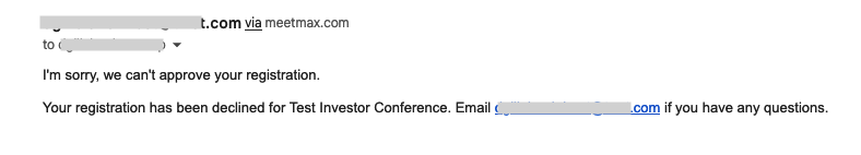 Once you’ve approved or declined a registration, a pop-up will appear. If you choose to send an email from here, MeetMax will generate an automated notification with a default message.
