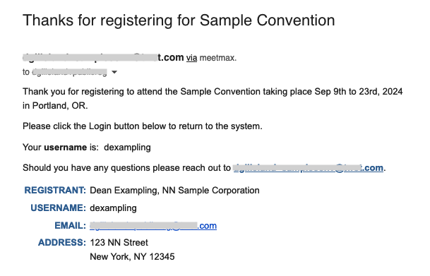 MeetMax will also email the registrant a confirmation with their login details for future use. It looks something like this: