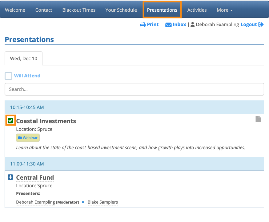 On the Presentations tab, the Company Rep can sign up to attend presentations: