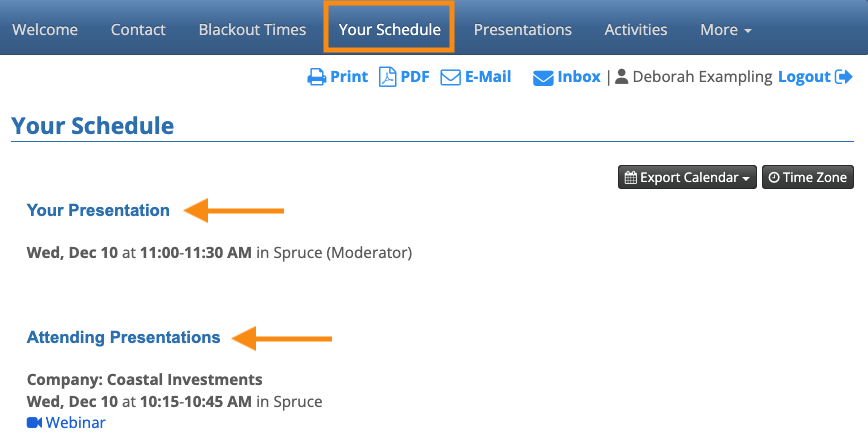 If they’re presenting, they’ll see the details of their session on the Your Schedule tab: