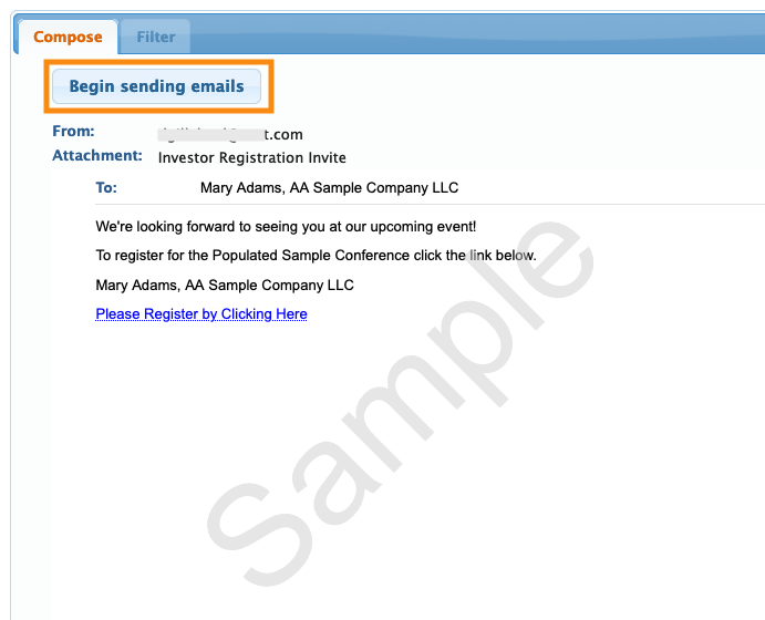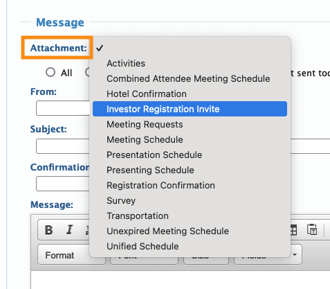 - Step 2. You're now in the batch emailer. Head to the Attachment menu. Choose Investor Registration Invite: