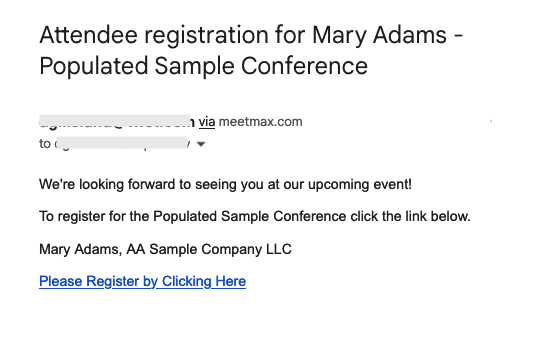 - Step 5. MeetMax will generate a unique email for each Attendee you’ve pre-registered, containing a link to complete their registration. The email looks something like this: