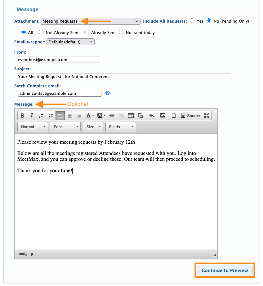 Copying and pasting directly from a Word document can create formatting issues. Instead, paste your text into a Notepad app first to remove all formatting. Then paste into the MeetMax editor. - Step 4. You’ll see a preview of one of the emails. Use the arrow icons to page through the rest of the emails in this batch.
