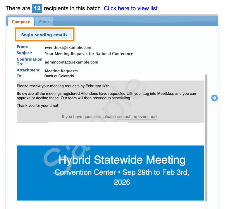- Be default, MeetMax sends emails in batches of 50. At the end of each batch, you’ll be prompted to send the next one: