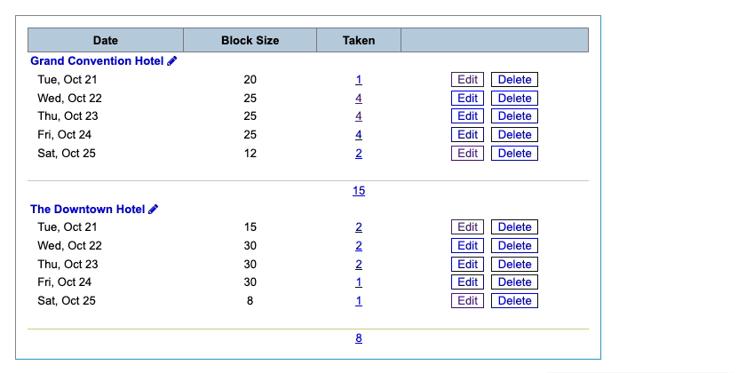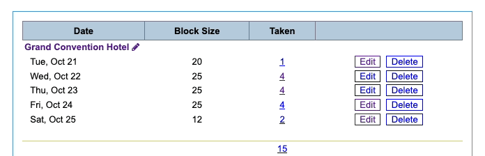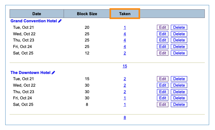 - As your participants start making reservations, the Taken column shows how many rooms have been used from each day’s block:
