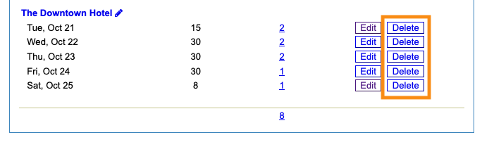 You’ll delete Hotel blocks one day at a time. Click the Delete button for each date.