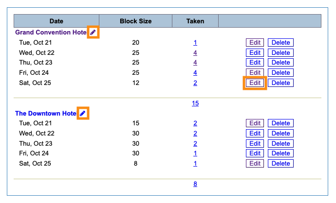 - To change the name of a hotel, or the nights in its room block, click the pencil icon next to its name.