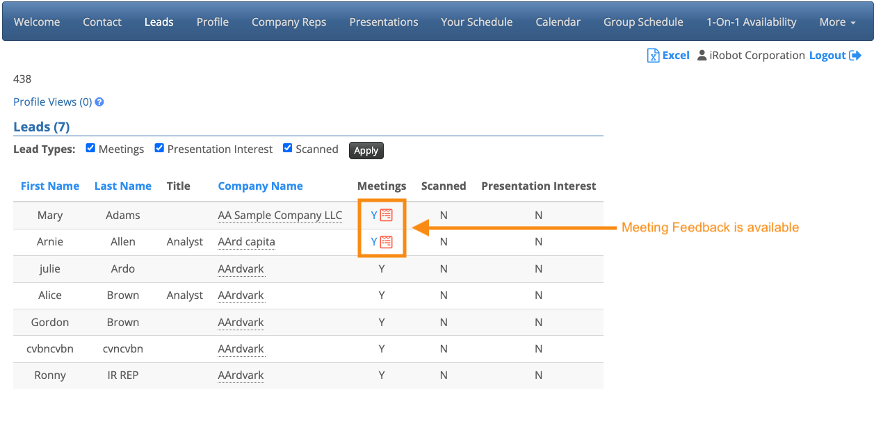 - Meetings: The Attendee met with the Company. If your event is using Meeting Feedback surveys, this information is also trackable (see below).