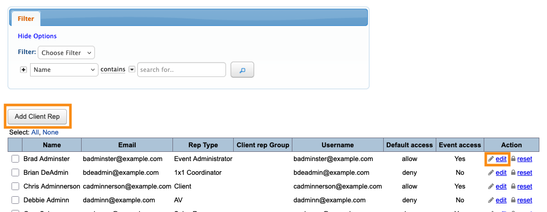 Alternatively, if you’ve imported your Attendees, you can update your original spreadsheet with the Client Rep Group assignments. Then our Support team can do an updated import. What the Client Rep sees
