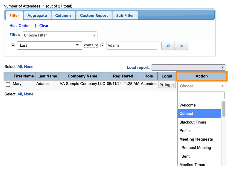 Step 2. Filter the list to locate the Attendee you need. Then use the Action menu to choose Contact: