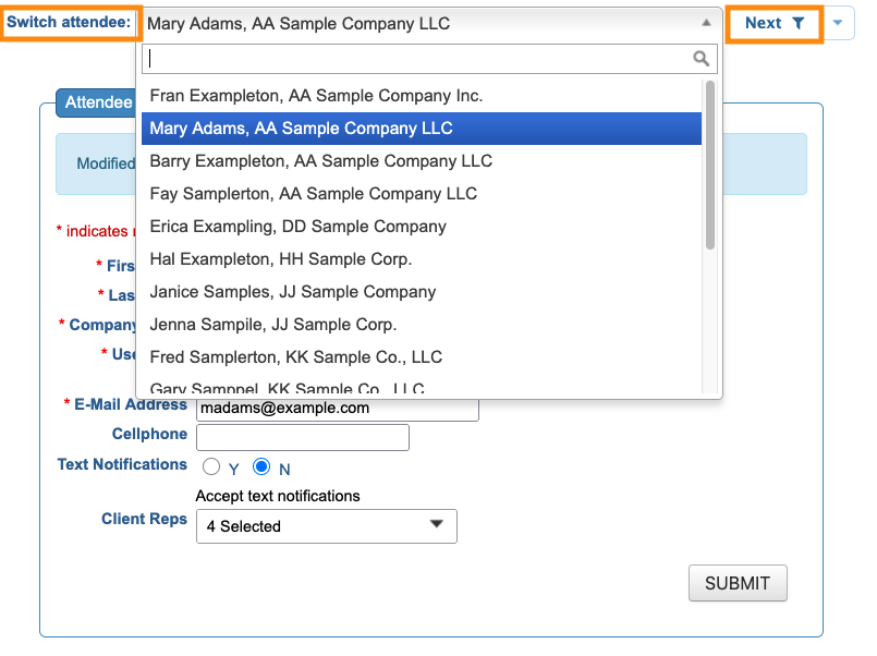 Step 4. To change to another Attendee’s record, use the Switch Attendee menu.