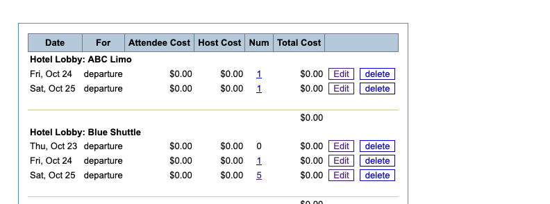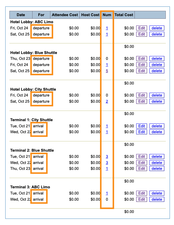 On this list, the Num column tells you how many Attendees have reserved transportation on each day.