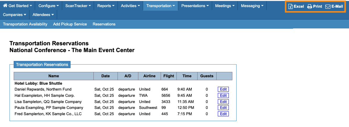 If you’d rather export, print, or email your entire list of all reservations, you can do that from the Transportation Reservations List.