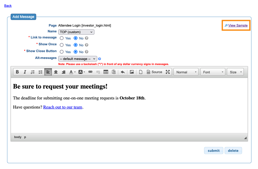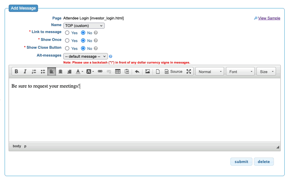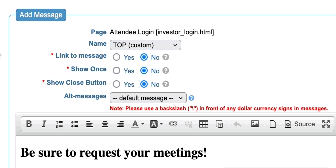 Let’s start by adding a Message to our Attendee login page. In this example, we’ll add a reminder of the deadline to submit meeting requests.