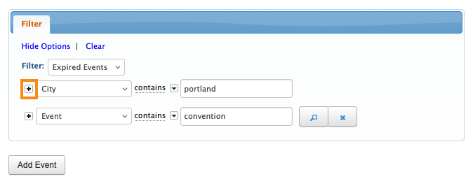 You can also use the + button to apply multiple filters. In the example below, we’ve done that. We’re searching our expired events for a specific city, with a key word in the event name: