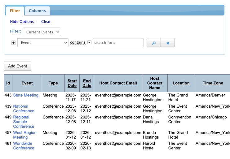 | The Type column was added in November 2025. Any existing events as of that date were automatically set to the default Conference type. You can change the type as needed from the Main Details settings. |