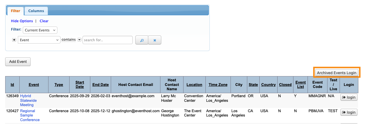 By default, the Event List is filtered to show only Current (upcoming) events.