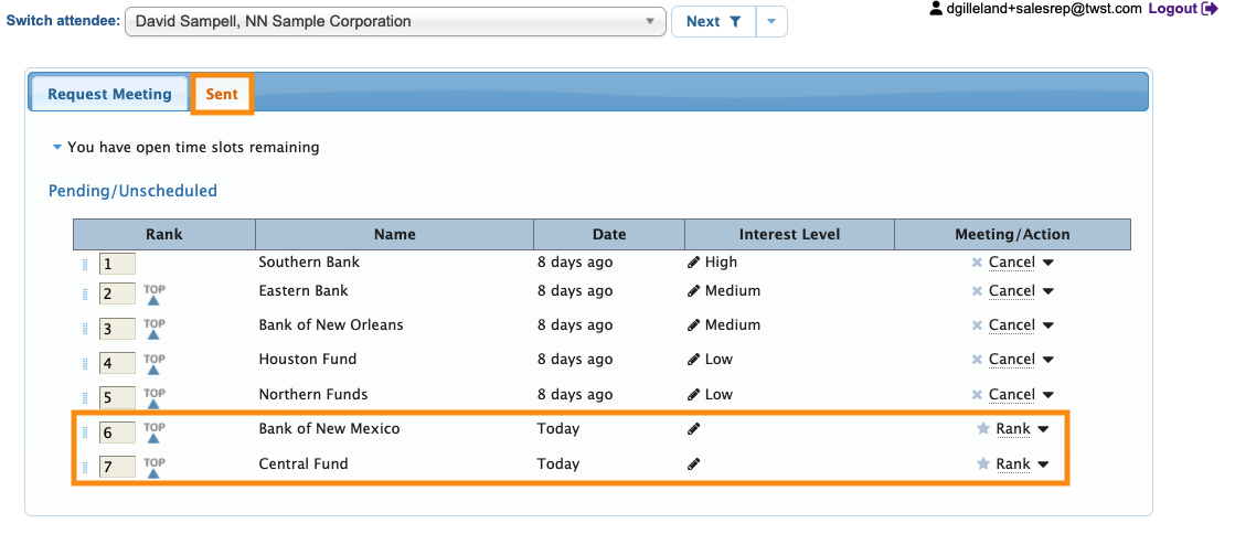 You can then click back over to the Sent tab. You’ll see the new requests there, and you can add rankings: