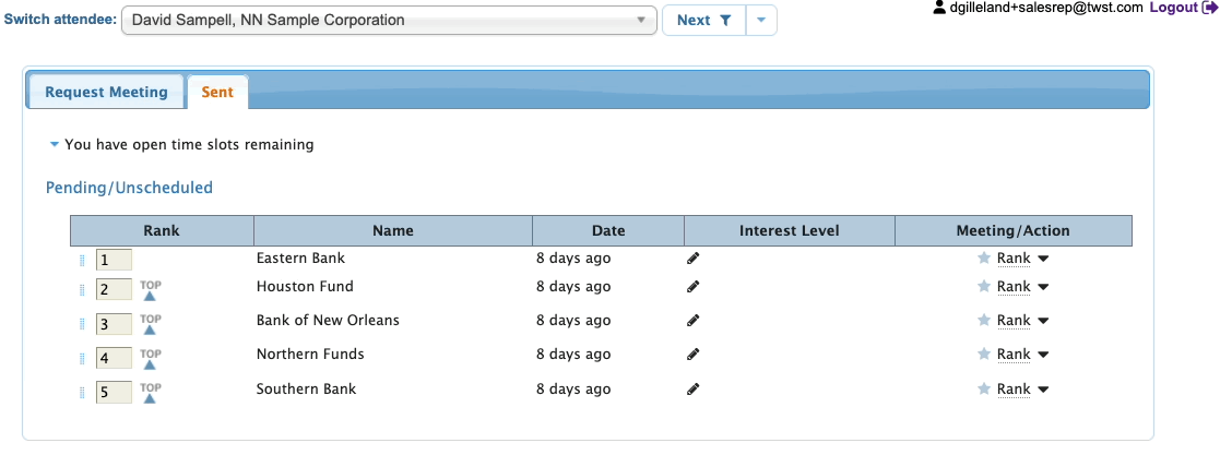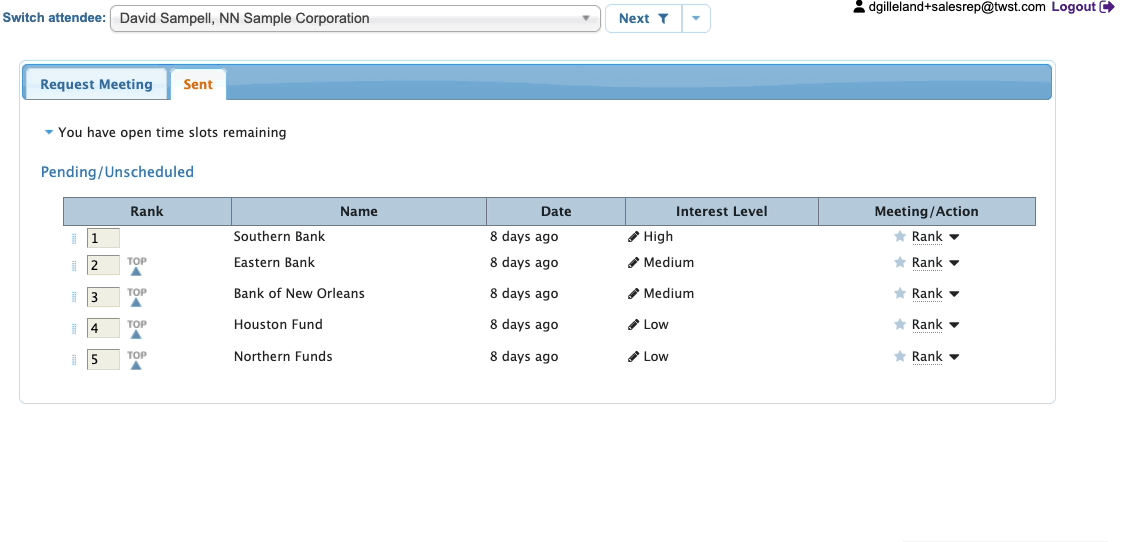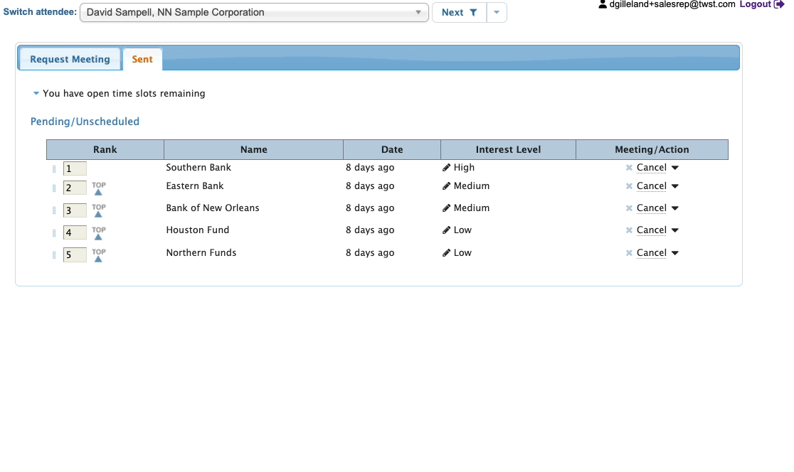 You can move any request to a different priority rank, so the event Admin can schedule the highest-value meetings. You can also add the Investor’s interest level in each meeting.