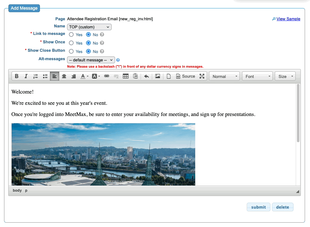 We’ll add a welcome message, a photo of the venue, and some instructions for the new registrant.