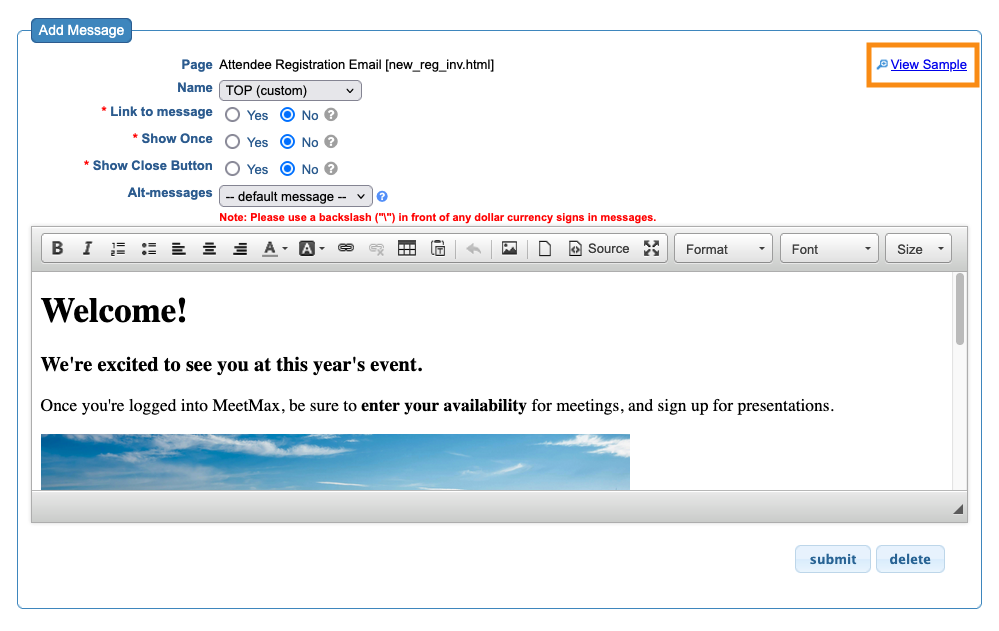 In these spots, you can add custom text and images (and update them anytime). In MeetMax, these content insertions are called Messages.