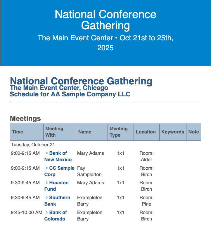 In the sample below, everyone from AA Sample Company will get a copy of this schedule, which combines all of their meetings: