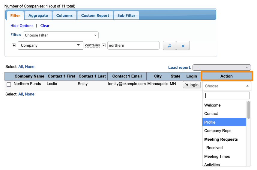 - Step 2. Choose any Company record - changes you make here will apply to every Company. Use the Action menu to choose Profile: