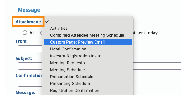 Once you’ve built your Custom Page email, you’ll access it in the batch emailer. It appears in the Attachments menu: