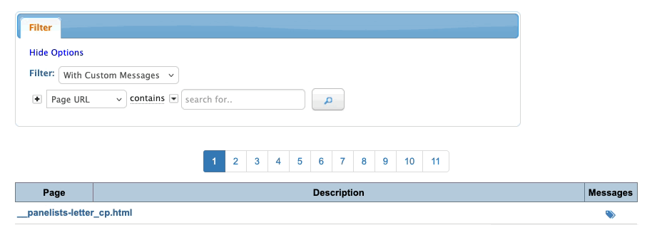 - Step 3. On the Messages page, filter by Page URL. Paste in investor_schedule.html: