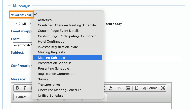 | The Unified Schedule Attachment will also display a combined schedule of meetings, presentations and activities. But it can’t have a custom Message inserted. You can use either Attachment, but if you need to add a custom Message, use Meeting Schedule. |