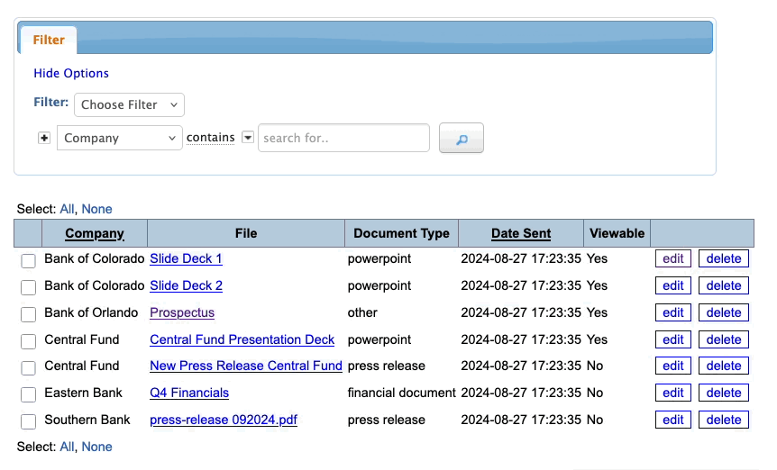 At the top of the list, you’ll find several handy filters. You can filter the list to see a single Company’s uploads, or filter by document type to see a specific type of file: