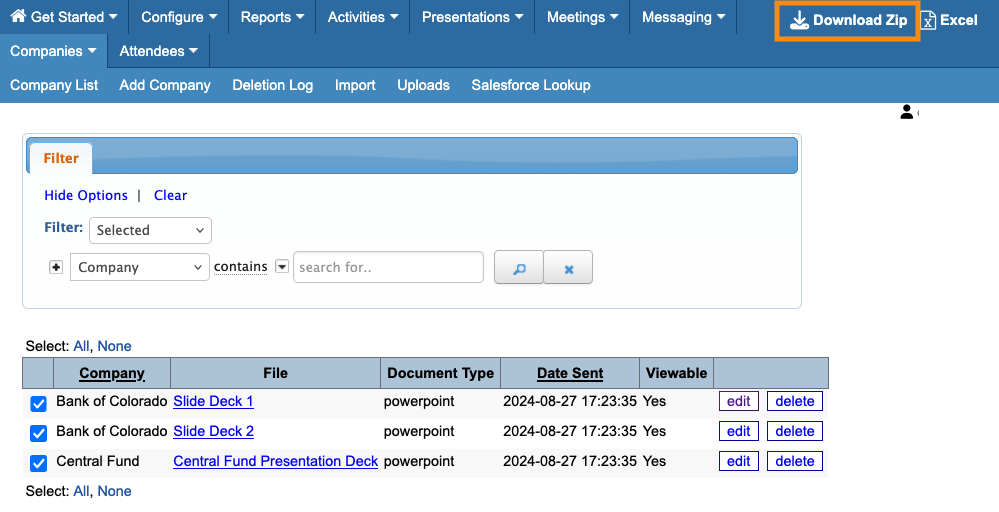 For files that Companies have uploaded, you can download selected files, or all files.