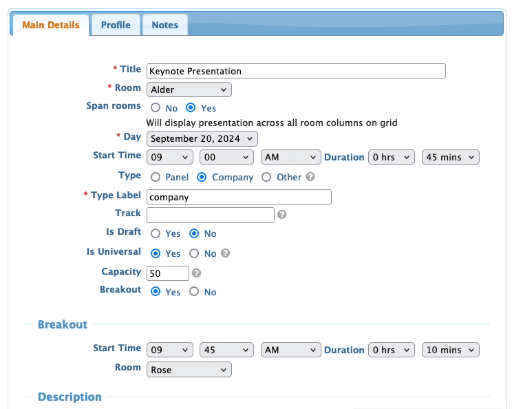 When you’re adding Presentations or Table Talks to your event, you’ll add session descriptions.
