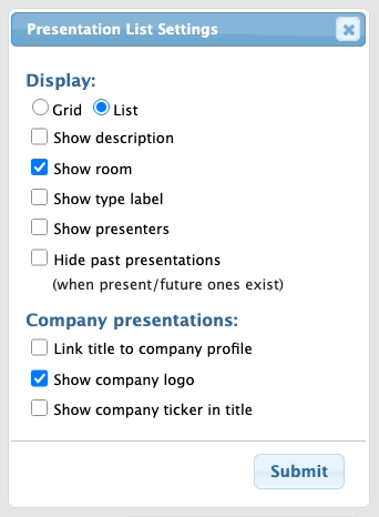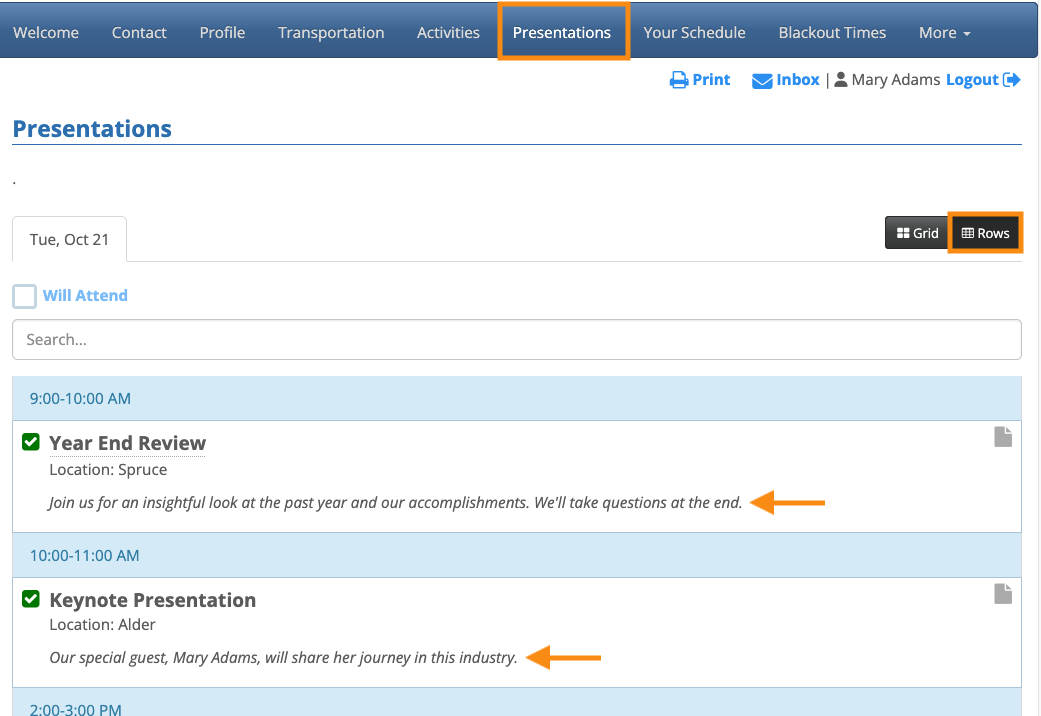 Presentation descriptions appear for both Companies and Attendees. You won’t see any descriptions in your Admin account, however. They only appear in the participants’ logged-in views. - On the participant’s Presentations page, you’ll see the descriptions in place: