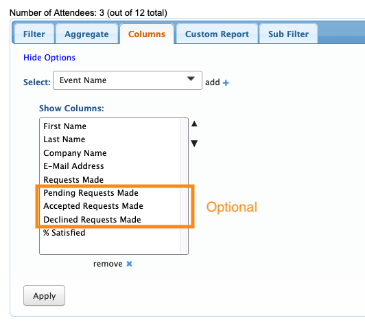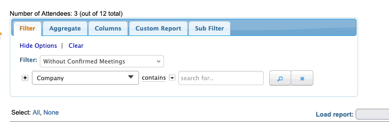 Your event might have slightly different names for these columns. You might not need all of these columns. If your meeting program doesn’t have an approval step for recipients of the meeting requests, for example, you can leave out the Pending, Accepted, and Deleted Requests columns - Step 3. Now, head to the Filter tab. Set the top filter to Without Confirmed Meetings: