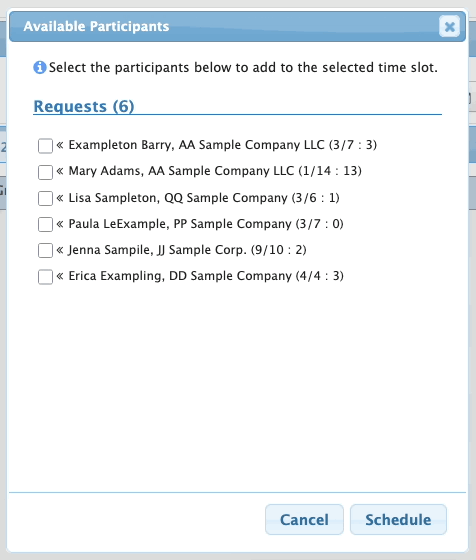 - Step 5. Click on one or more of these Attendees, then click Schedule. That books them into a meeting at this time: