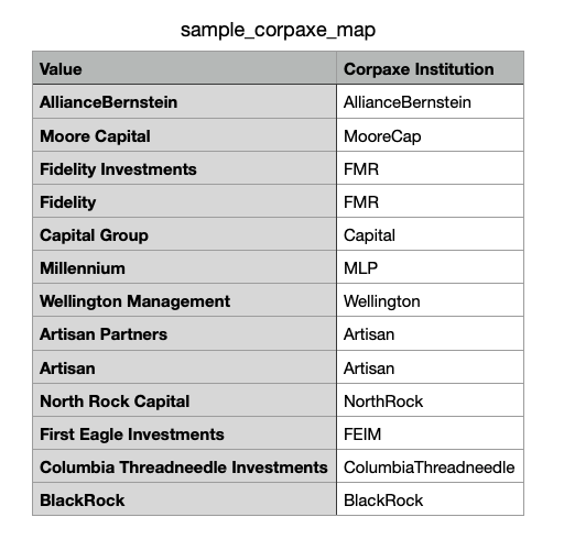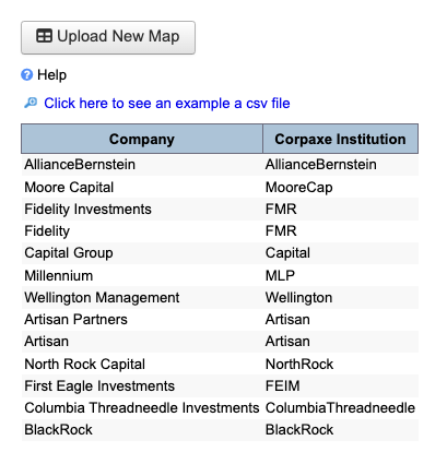 This map is a spreadsheet, listing your Company Names in MeetMax alongside their matching Institutions in Corpaxe. Below is an example.