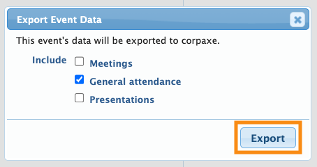 - You can send data to Corpaxe multiple times. Details change throughout your event, so you can export any time you need to update Corpaxe. Each export overrides the previous one.