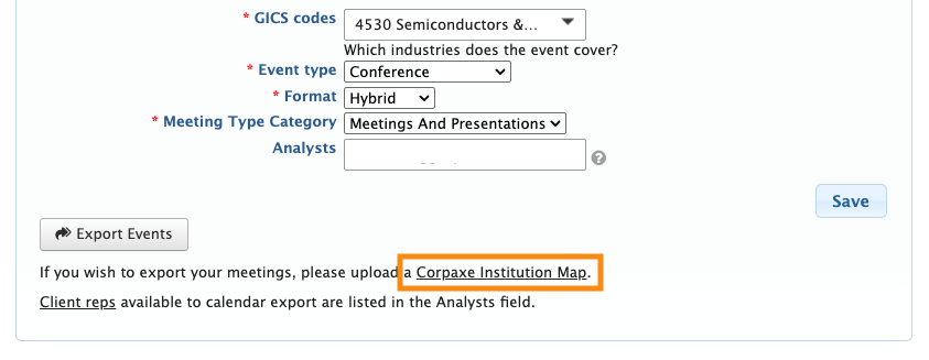 - Export Events: Sends the general event details you’ve configured in the form above. You’ll use this button first, to list your event on the Corpaxe Calendar.