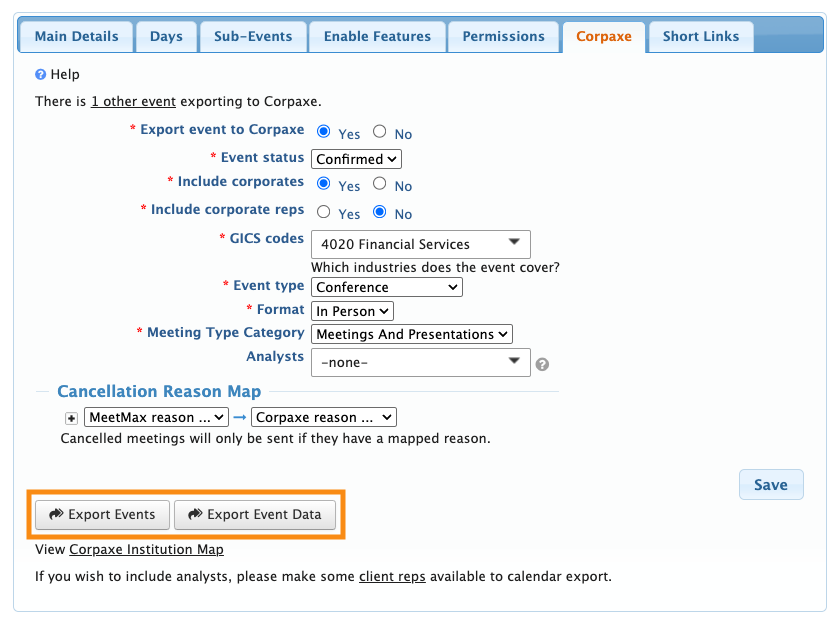 You’ll also see a new Cancellation Reason Map section on this page. You only need it if you’re exporting your event’s meetings to Corpaxe. If not, you can ignore it.