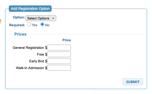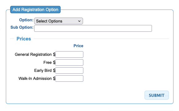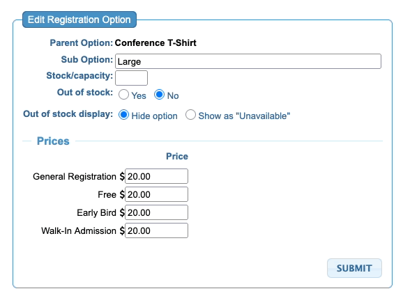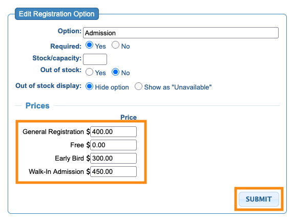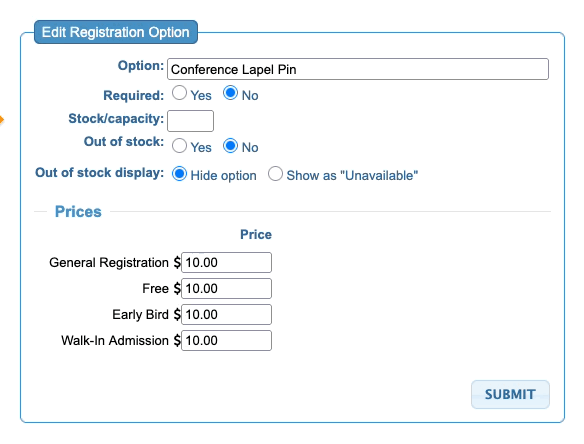 - Step 6. Add the price each of your Registration Types will pay for this item. Then click Submit to save.