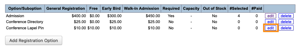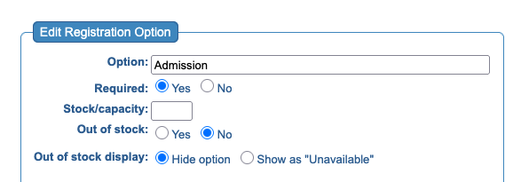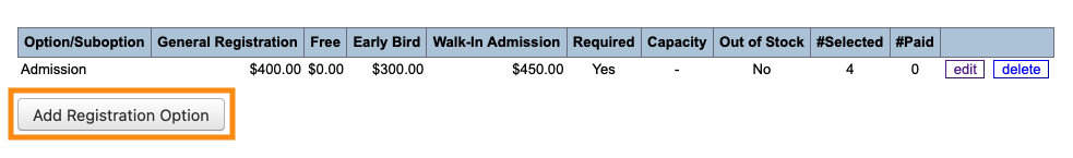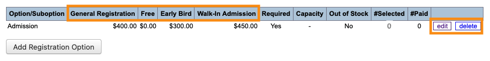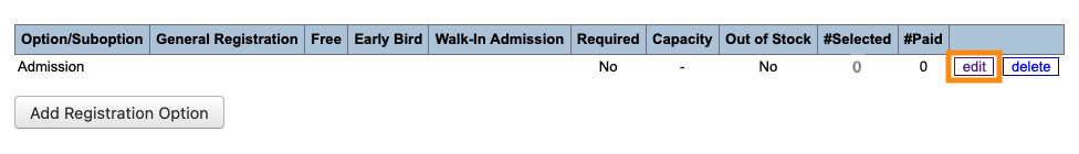 - Step 2. Since we’re creating a Registration Option for admission prices, we’ll edit the default Admission entry: