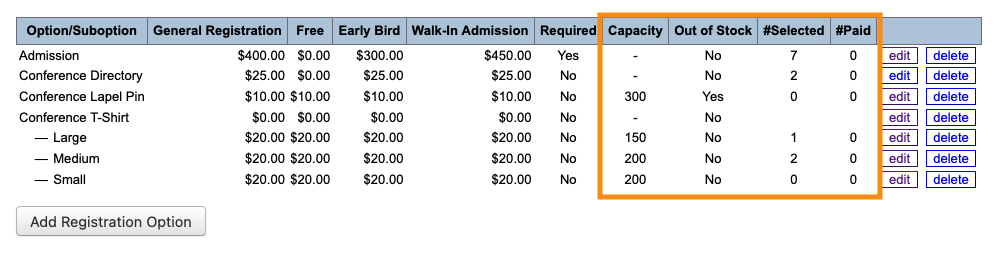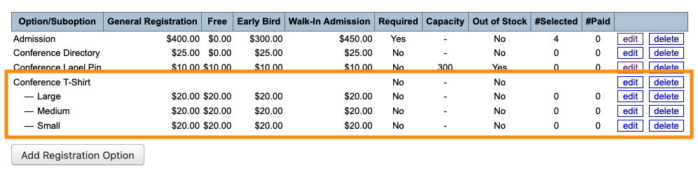 - The new suboption is now visible in your list of Registration Options. Here’s what it looks like once we’ve added the other two t-shirt sizes as Suboptions: