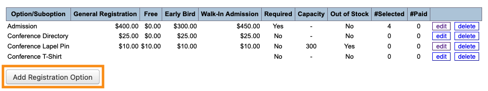 The Registration Options page has columns that track how many of your participants have chosen each item, and how many have paid for it:
