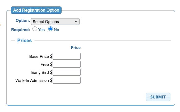 - Registration Options represent pricing - both for admission tickets, and for add-on options like the ones above.