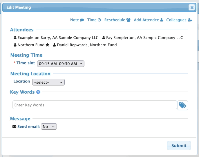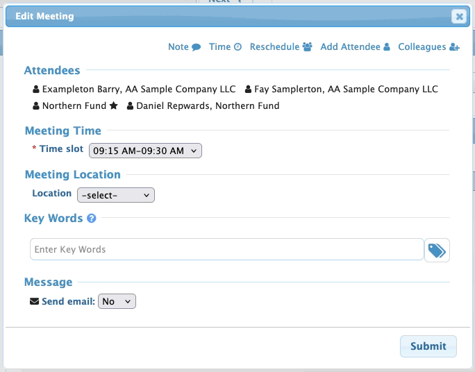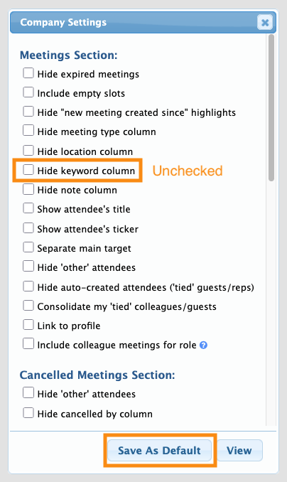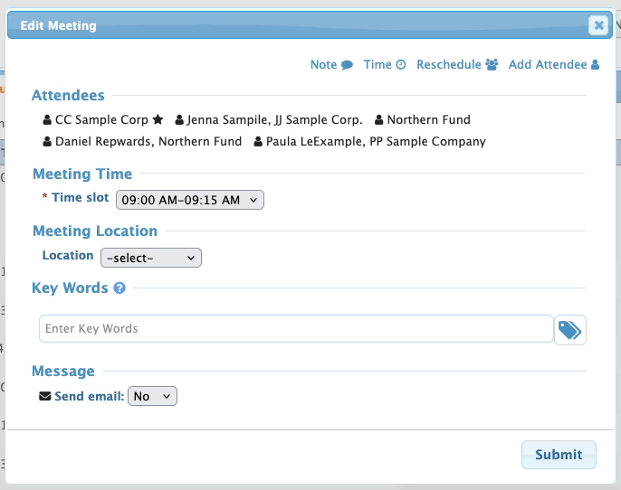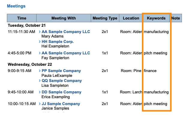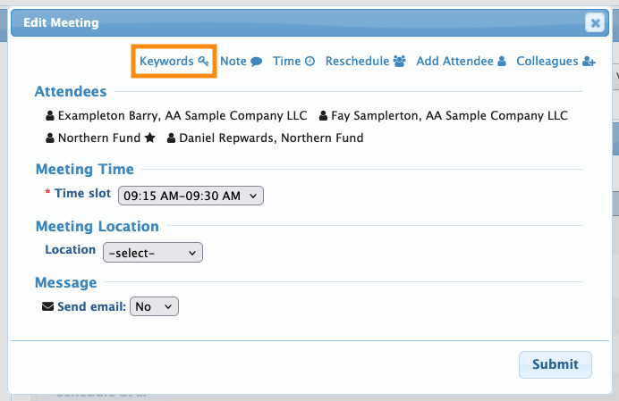 You’ll add keywords from the Meeting Times pages, for either Attendees or Companies: