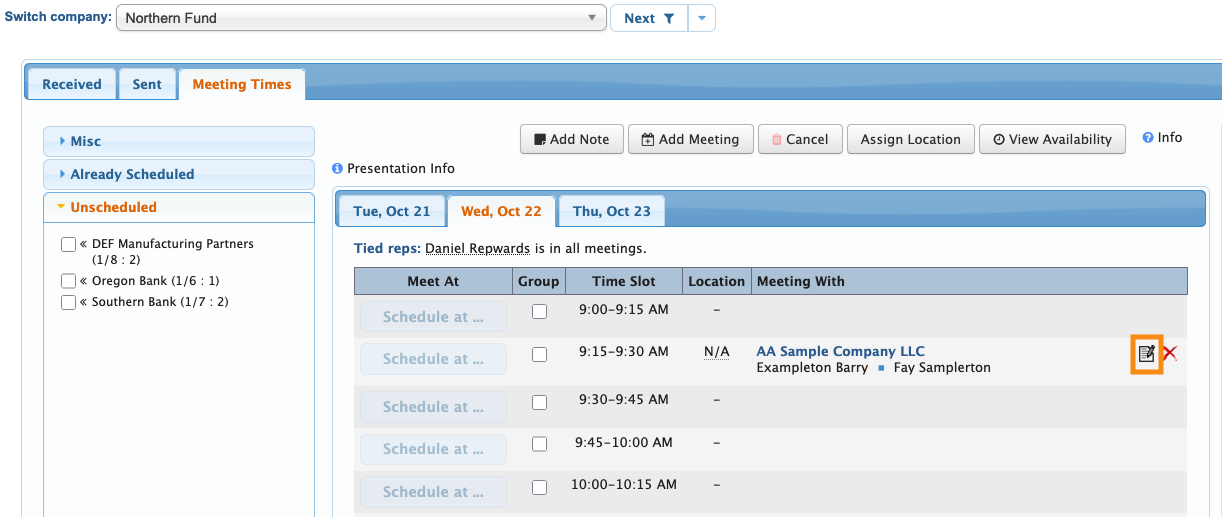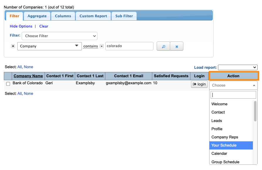 - Step 2. Filter the list to locate the Company you need. Use the Action menu to choose Meeting Times: